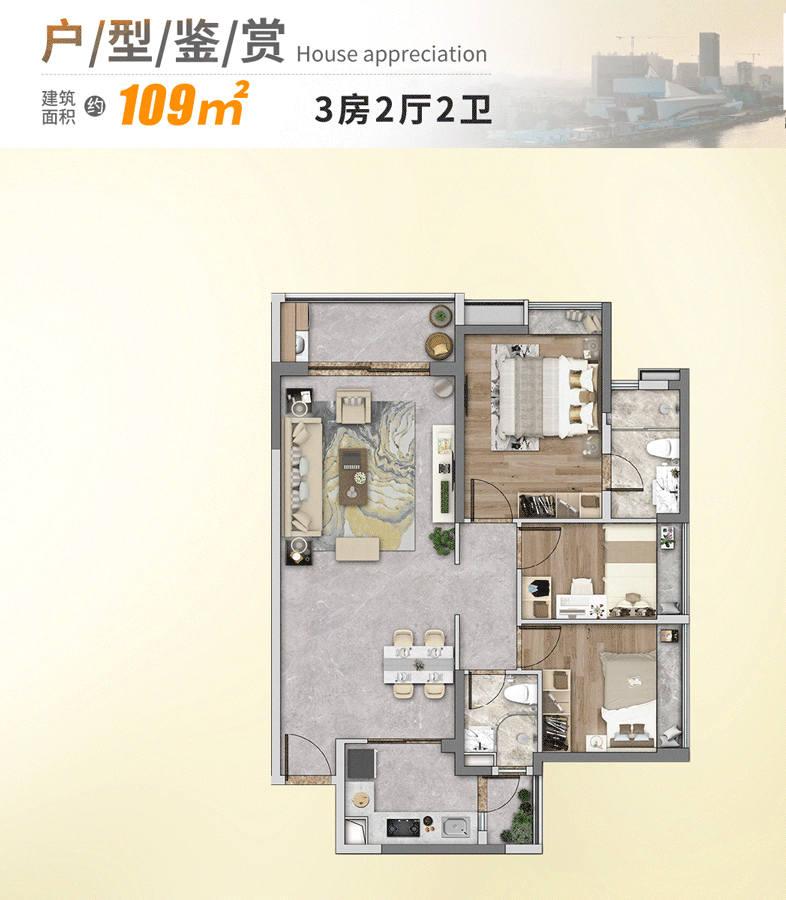 建面约109㎡江景大三房,三面单边,推窗即旖旎江干,清风裹挟着水汽,似无形轻幔悄悄入室。春节烟花夜,立于窗前,便能静赏「火树银花开,星桥铁锁开」的绚烂奇景。