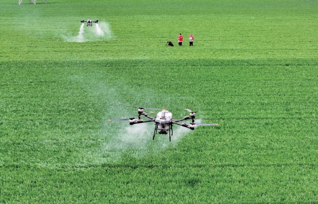 2025年4月18日,正在聊城市茌平区乐平铺镇大尉庄村高尺度农田里,手艺人员操做植保无人机进行小麦“一喷三防”功课。
